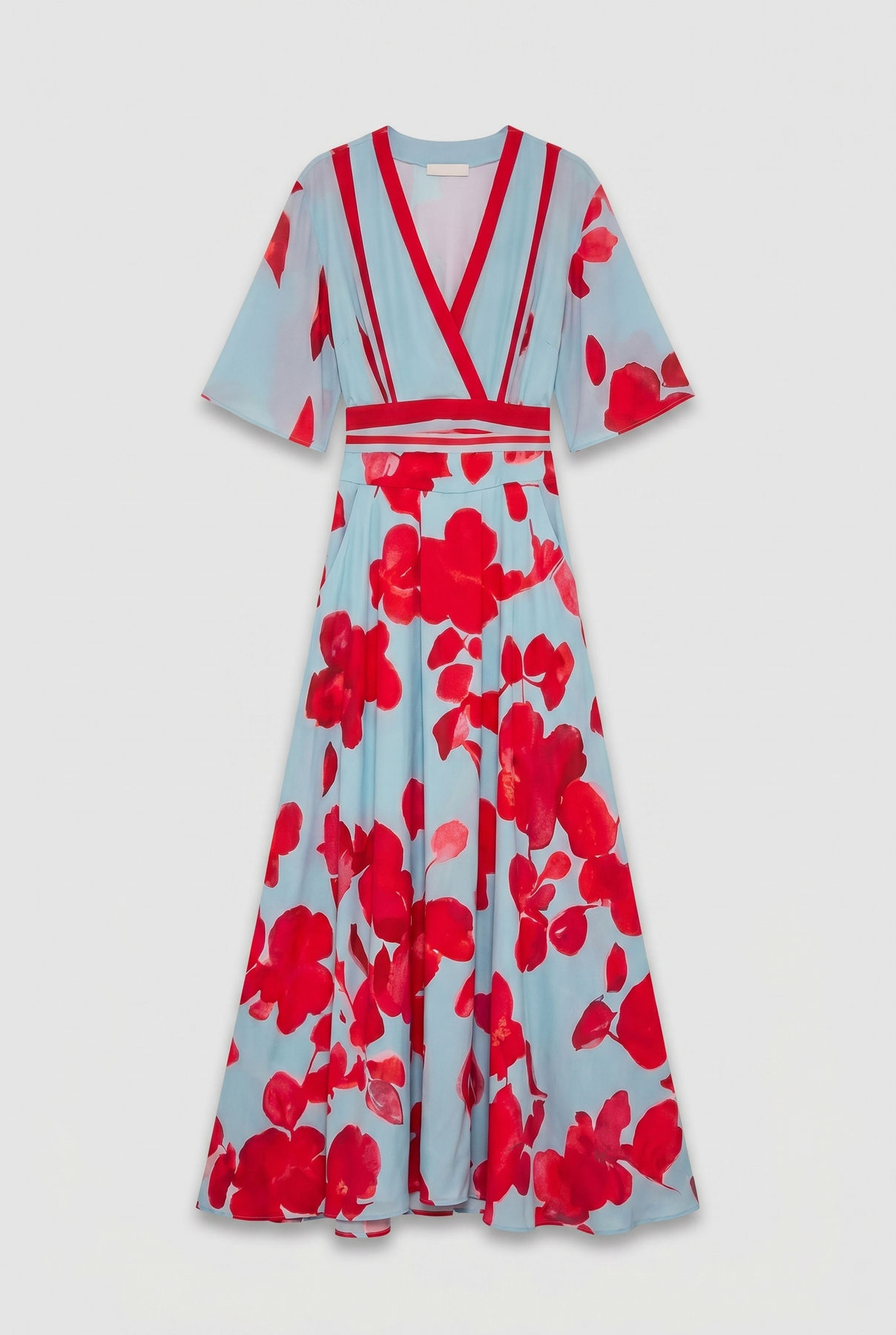 Cette robe portefeuille longue se distingue par son imprimé floral contrasté et sa silhouette évasée. Le décolleté croisé et la taille marquée structurent l’ensemble avec précision.