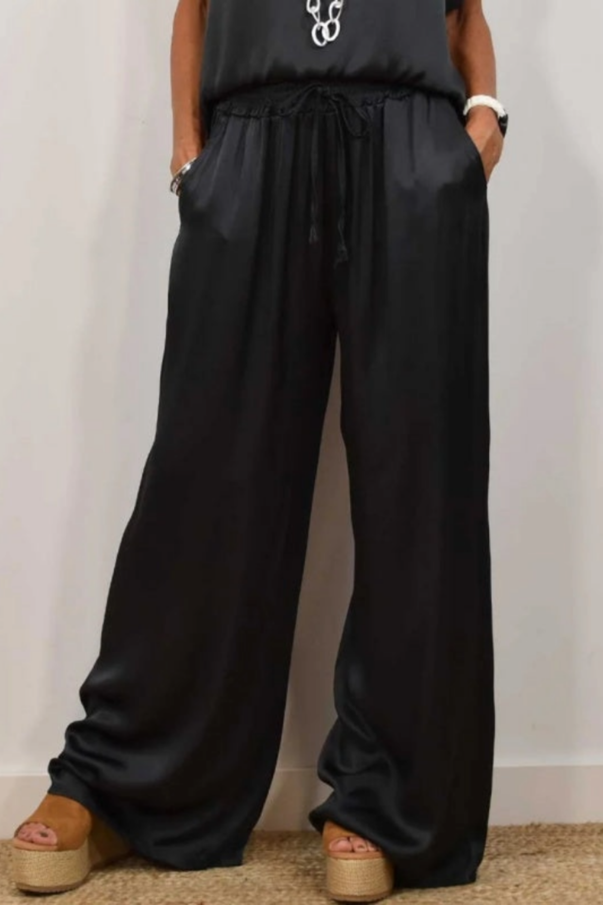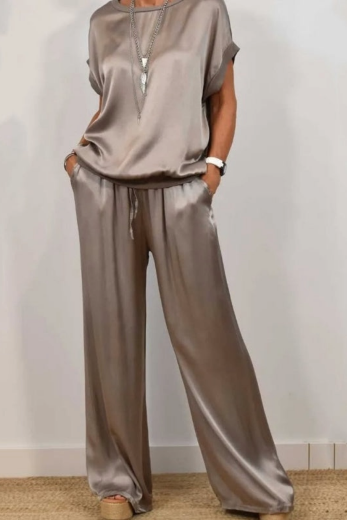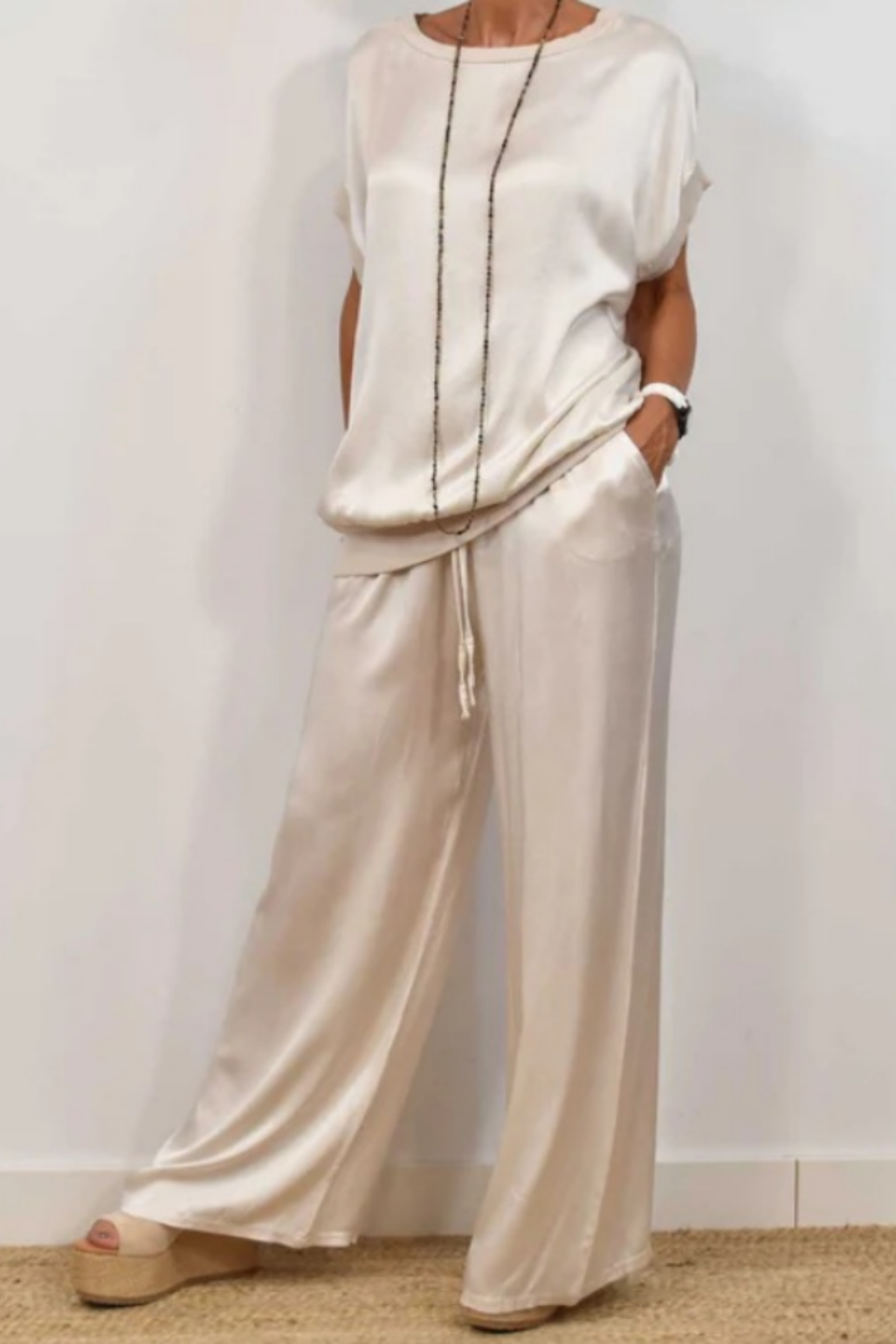 Maréa | Ensemble deux pièces se présente comme un ensemble fluide composé d’un haut et d’un pantalon ample. La surface lisse et la légère brillance confèrent à l’ensemble une allure sobre et épurée. La silhouette est à la fois détendue et équilibrée.